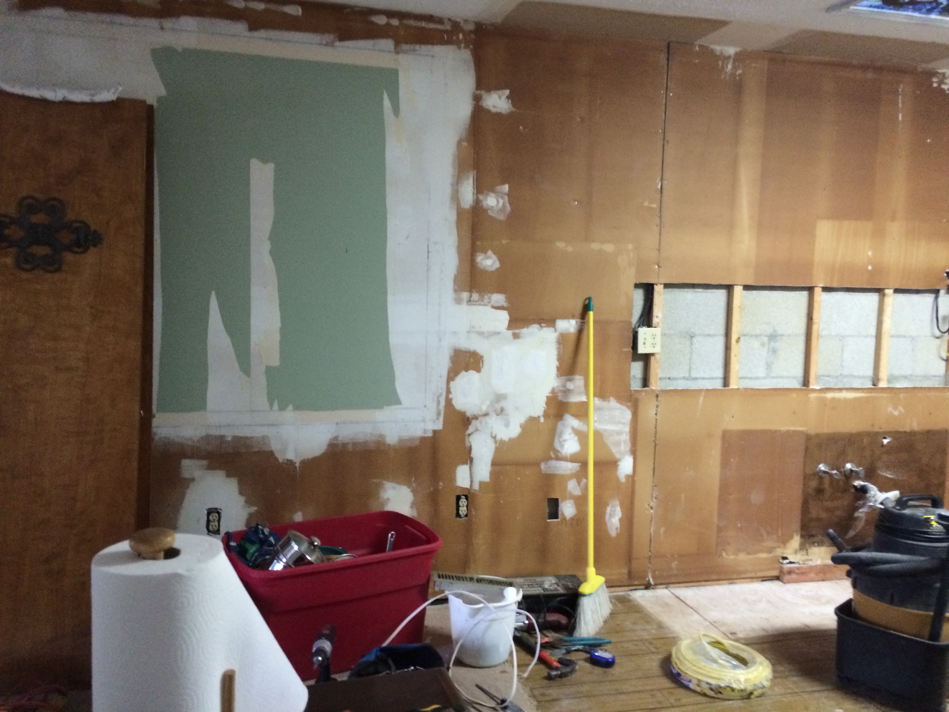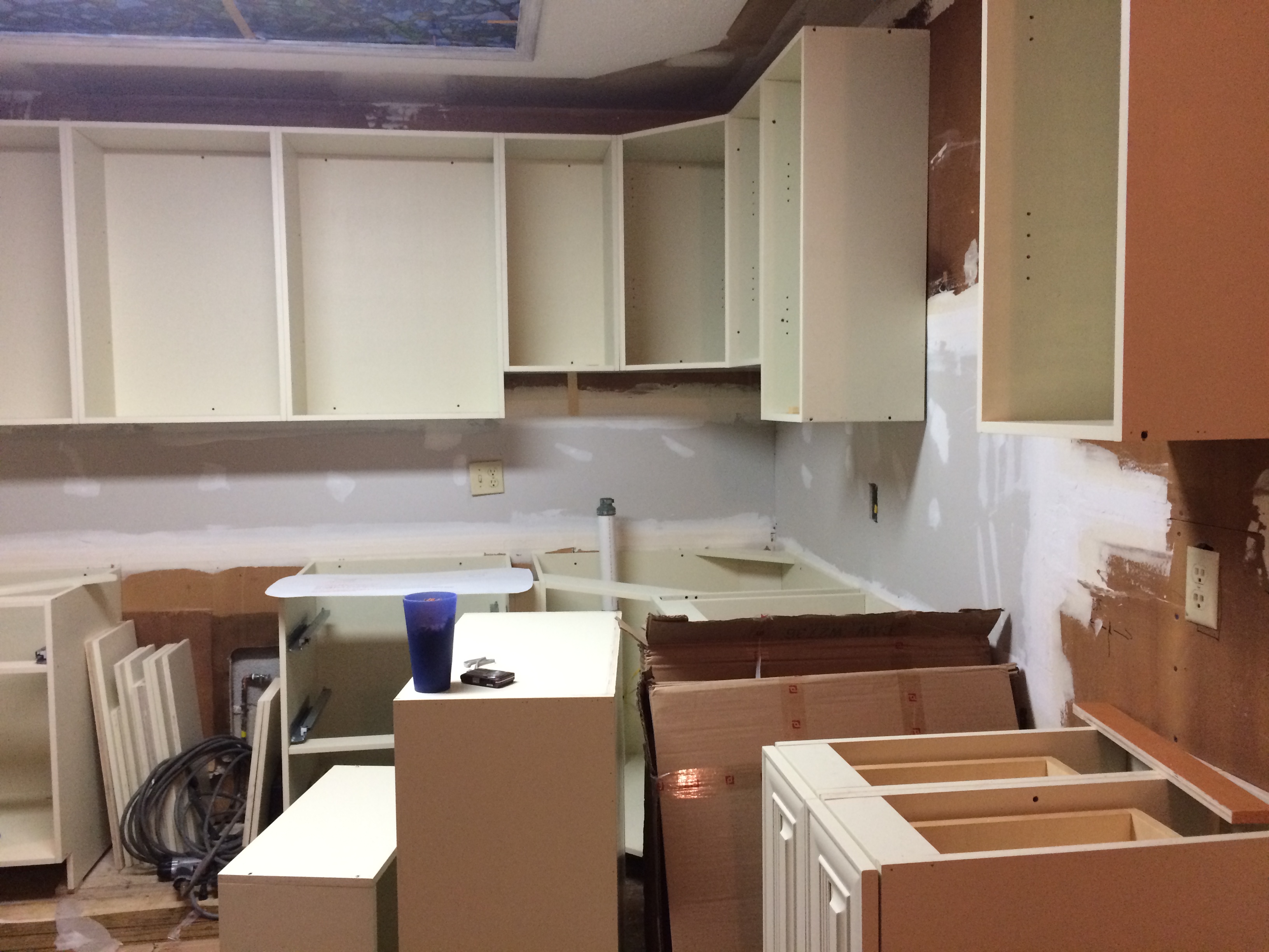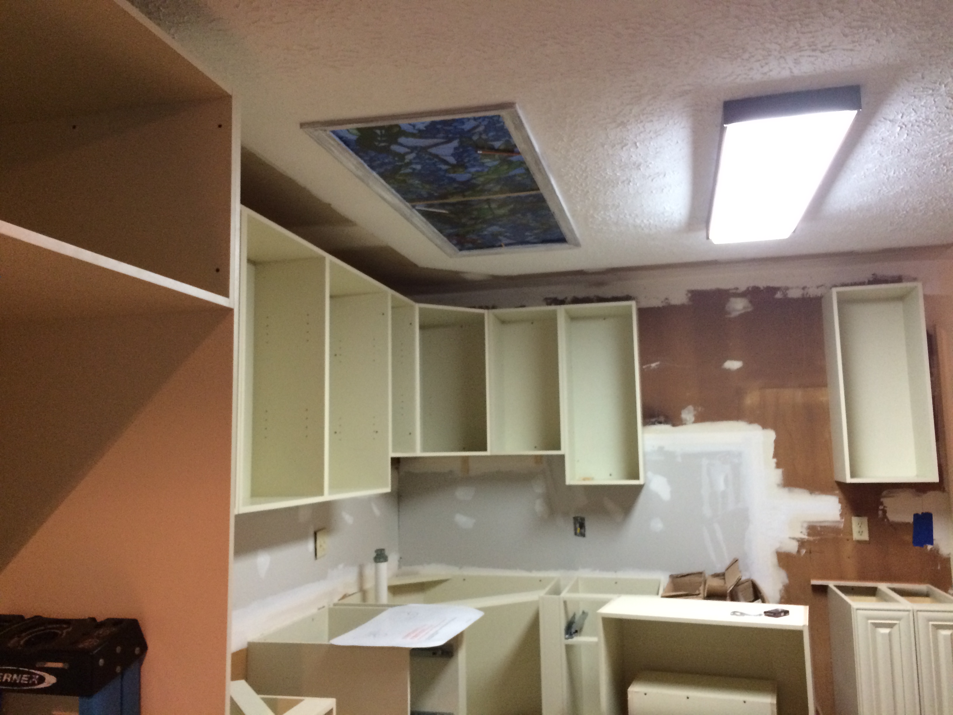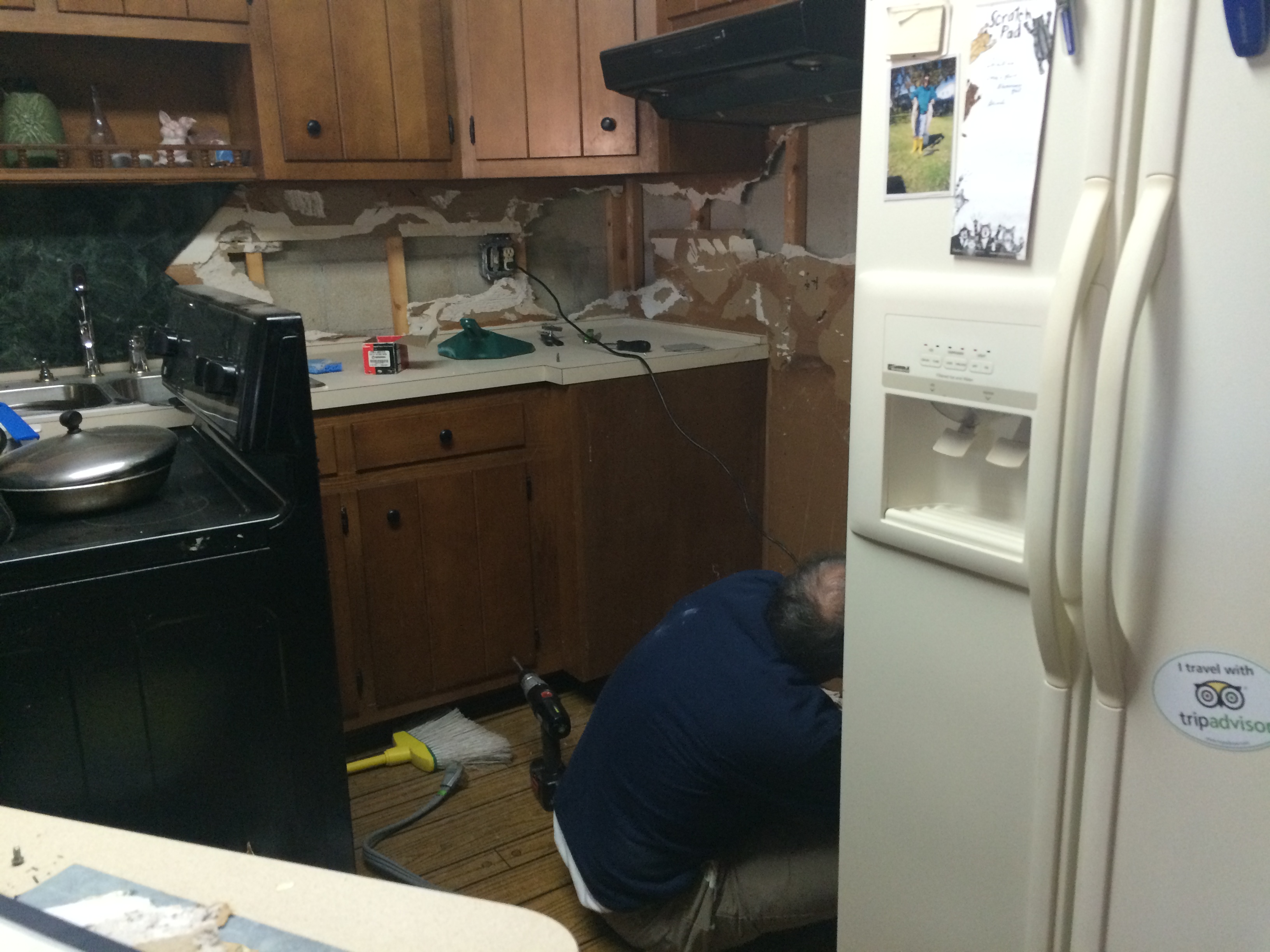 In other news, the kitchen has cabinets (some with doors that need replacement), countertops, sink, faucet, and appliances. Some shelf-paper has been laid and a few dishes put in place. Floor is 90% finished, with only the toe molding and last bits of corner pieces left to be laid. We still will likely have to touch up paint. And we need to get a kitchen table/chairs in place. But it is a million miles from where it was 30 days ago. And for the record, a 65″ TV is awesome.